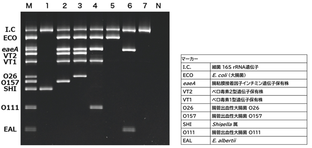 また、Multiplex PCRによりベロ毒素遺伝子(VT1, VT2)や腸粘膜接着因子インチミン遺伝子eaeAの検出、腸管出血性大腸菌O抗原型(O157/O26/O111)の識別が可能です。