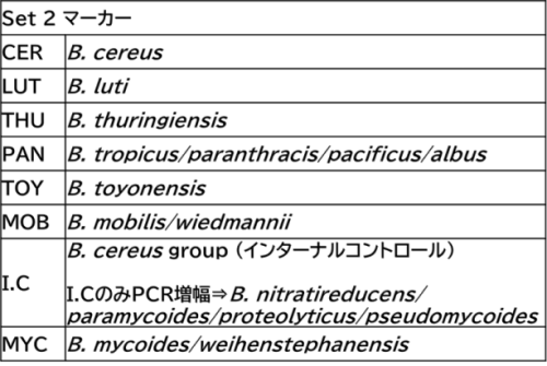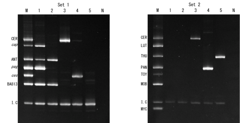 15種類のプライマーを含む、2種のプライマーセットを組み合わせた試験により検体のB. anthracis、B. cereus への帰属の可能性、毒素遺伝子の有無が推定できる他、B. anthracis、B. cereus 以外であった場合は、帰属候補種が推定できます。検体がどの菌群に帰属するのかおよび嘔吐毒素合成遺伝子保有の有無を推定することができます。
