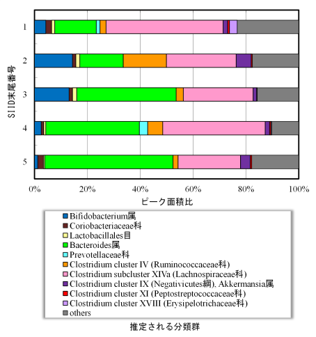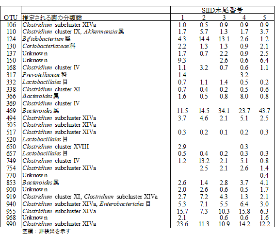 • Bifidobacterium 属、 Bacteroides 属などヒト腸内細菌叢の主要な分類群をOTU化して構成比率を比較