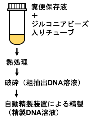 当社保存液入りの糞便採取キットを使用した糞便からのDNA抽出は、保存液に含まれるグアニジン塩などの作用により採便後の保存中もDNaseなどの酵素の不活化と溶菌が進行することから、室温で保管しても採便時の菌叢が維持されます。また得られたDNA抽出物は、T-RFLPフローラ解析やアンプリコンシーケンス解析に使用可能です。