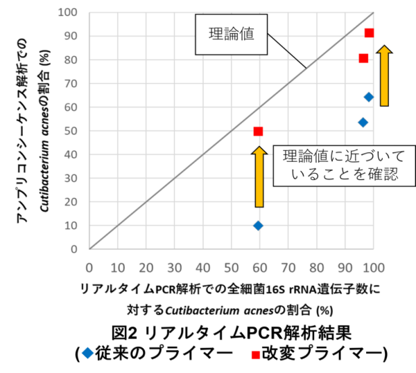 リアルタイムPCR解析において、全真正細菌の16S rRNA遺伝子数に対するC . acnes の遺伝子数の割合がより理論値に近づくことを確認しています (図2) 。